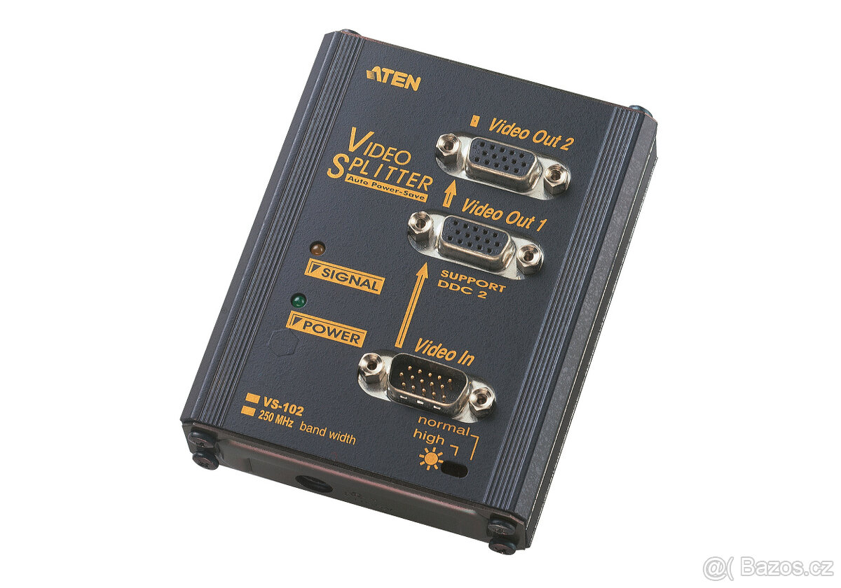 Prodám video splitter ATEN VS102. Rozděluje video vstup na 2 video výstupy. Vysoké rozlišení videa - až 1920 x 1440. Podporuje šířku pásma až 250 MHz. Kaskádovatelné do 3 úrovní – poskytuje až 8 video signálů. Ideální např. k rozdělení z PC na monitor + projektor. Použitý, velmi dobrý stav. Cena pouze 690Kč. Možno zaslat přepravní službou. Obrázky jsou ilustrativní. Telefon: 728425479