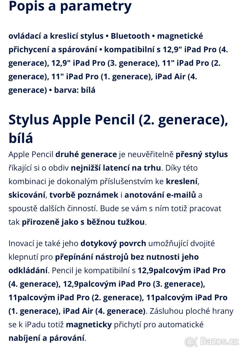 Nabízíme k prodeji Stylus Apple Pencil (2.generace). Byl to vánoční dárek pro dceru. Jen rozbaleno a “vyzkoušeno”. Bohužel jsme špatně objednali a není kompatibilní s jejím iPadem 😞. Protože Ježíšek nakupoval v Datartu dopředu 6.12.2025, tak lhůtu pro vrácení jsme propásli. Bližší popis a parametry viz.fotka. Možnost osobního vyzkoušení, záruka 24 měsíců, faktura součástí. PC 3.027,-. Cena dohodou.