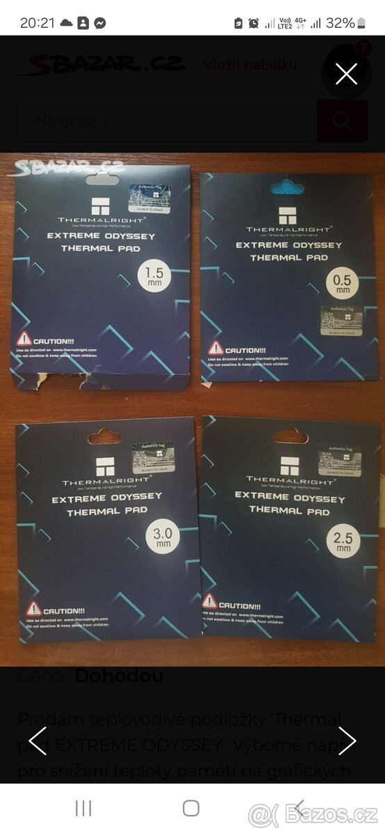 Prodám teplovodivé podložky 'Thermal pad EXTREME ODYSSEY'. Výborné např. pro snížení teploty pamětí na grafických kartách (RTX 3080 apod). Osobně vyzkoušené na několika kusech grafických karet. Pokles teplot až o 20°C. Mám k prodeji Odyssey 12.8 W/mk nebo VALOR ODIN 15 W/mk. K prodeji rozměry 120x120mm. Po dohodě mohu nařezat menší rozměry. Tlouštky k prodeji: 0.5, 1,5, 2,5 , 3mm. Odyssey nemám 1 a 2 mm .
