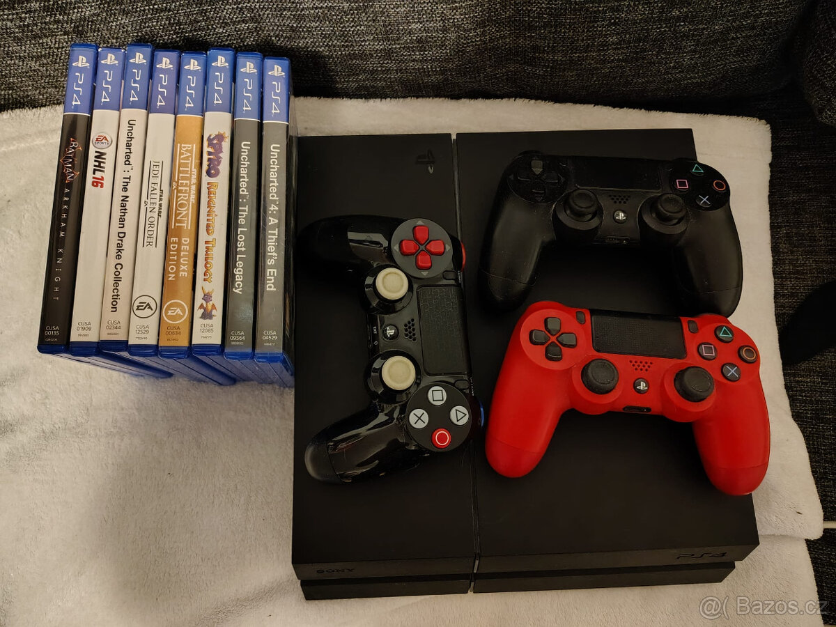 PS4, 500GB + 2 ovladače - [12.2. 2026]Prodám PS4, 500GB se dvemi ovladači bez záruky. Plně funkční, v továrním nastavení, připravený pro nového uživatele. Možnost dokoupení her-viz poslední foto. Cena za hru 150 Kč / kus.