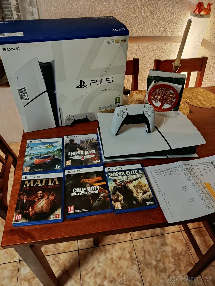 Prodám zánovní konzoli Sony PS5,zakoupenou v prodejně Datart v srpnu 2025 s prodlouženou zárukou na 3 roky s pojištěním náhodného poškození na 2 roky (viz. faktura + pojištění). Konzole a příslušenství jsou v naprosto skvělém stavu. K tomu přidám 5 ks skvělých her v celkové hodnotě cca 5000,-Kč( viz. foto ). Preferuji osobní odběr, pokud přesto bude zájemce chtít konzoli zaslat, zašlu mu jí pouze po obdržení platby na můj účet. Původní cena bez her 15.488,-Kč, nová cena 10.000,-Kč včetně 5 ks skvělých originálních her.