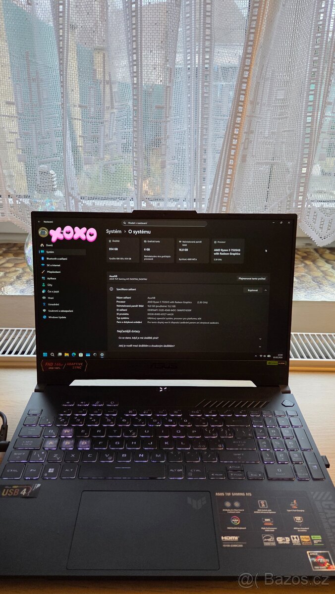 podsvícená RGB klávesnice, webkamera,dva USB 3.2 Gen2 , dva USB-C,HDMI, WiFi 6, Bluetooth,240W adaptér. Windows 11 pro. Je ve stave nového kusu, žádné poškození, celou dobu ležel a používal se na stole. Záruka je do srpen 2026. Přiložím fakturu. Záruka jde i přikoupit u Asusu. Včetně originální krabice + přidám herní myš Asus (taky záruka).