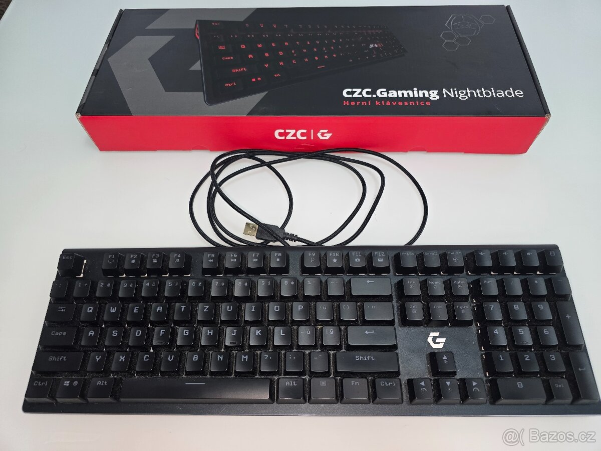 Prodám svou drátovou fullsize mechanickou herní klávesnici značky CZC model Nightblade v barvě černé. Spínače Outemu Red, české popisky, nastavitelné RGB a makra přes aplikaci. Klávesnice je plně funkční bez žádných problémů, ale koupil jsem si novou, tak již nevyužiji. Ke klávesnici je originální krabice včetně podložky pod ruce a pinzety na spínače. Možnost osobního předání v Ostravě nebo zaslání.