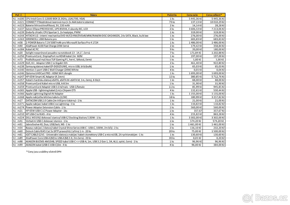 Předmětem výběrového řízení je 227 položek movitého majetku, zejména výpočetní techniky a spotřebního materiálu, například stolní počítače, notebooky, monitory, tiskárny, datová média (SSD/HDD/USB), síťové prvky, dokovací stanice, tonery a inkoustové kazety, fotoaparáty a další příslušenství. Seznam majetku je rozdělen do sedmi logických souborů, tento konkrétní inzerát se vztahuje k souboru č. 6 – komponenty a příslušenství (napájecí zdroje, UPS, náhradní díly). Přesný výčet položek tohoto souboru lze nalézt v příloze pod inzerátem. Majetek se neprodává po jednotlivých kusech, nabídku lze podat pouze na celý určený soubor. Výjimečně může zájemce navrhnout vlastní kombinaci položek z různých souborů, pokud celková hodnota takto sestaveného souboru překročí 50 000 Kč vč. DPH. Tuto kombinaci je nutné v nabídce přesně specifikovat.