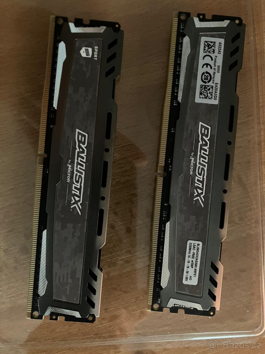 Crucial Ballistix DDR4 16GB (2x8GB) - [10.2. 2026]Dobrý den,nabízím paměti RAM Crucial Ballistix o kapacitě 16GB (kit 2x8GB). Jedná se o model s frekvencí 3200 MHz a časováním CL16 (přesné označení BL2K8G32C16). Jsou ideální pro herní PC, skvěle si rozumí s procesory Intel i AMD Ryzen.