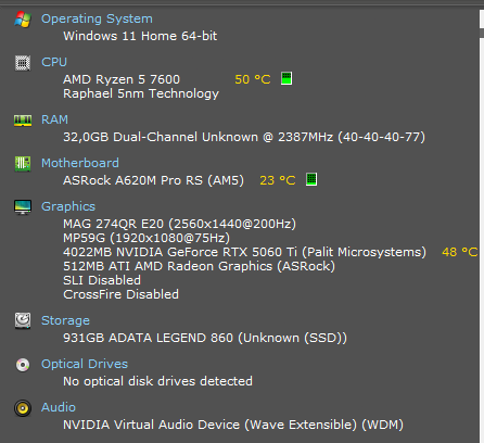 Specifikace jsou : DDR5 32GB, 5060 Ti 16GB, procesor AMD Ryzen 5 7600 6-Core Processor,