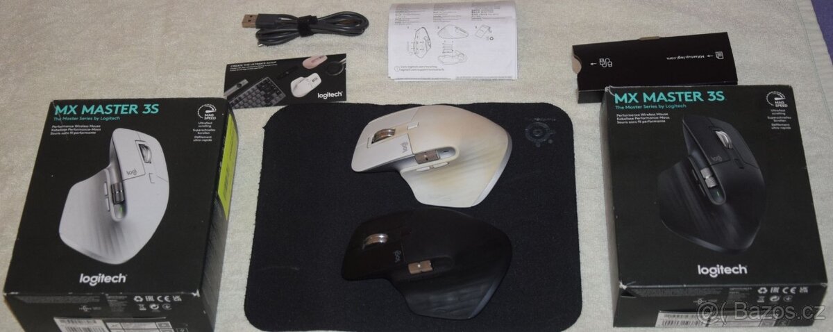 MX Master myši od Logitech - pro obě zvášť USB přijímač pro více bezdrátových zařízení Logitech - myš funguje také i v Bluetooth režimu ale přes USB bývají lepší odezvy. Šedá myš /Master MX 3S/ povrch je světlý a časem vypadá používanější než černá. Obě myši delší dobu nevyužívané, baterie ok, velmi dlouhá doba použití na 1 nabití, tlačítka lze proklikat a vyčistit pro nejlepší funkčnost. Krabice a USB C nabíjecí kabel.