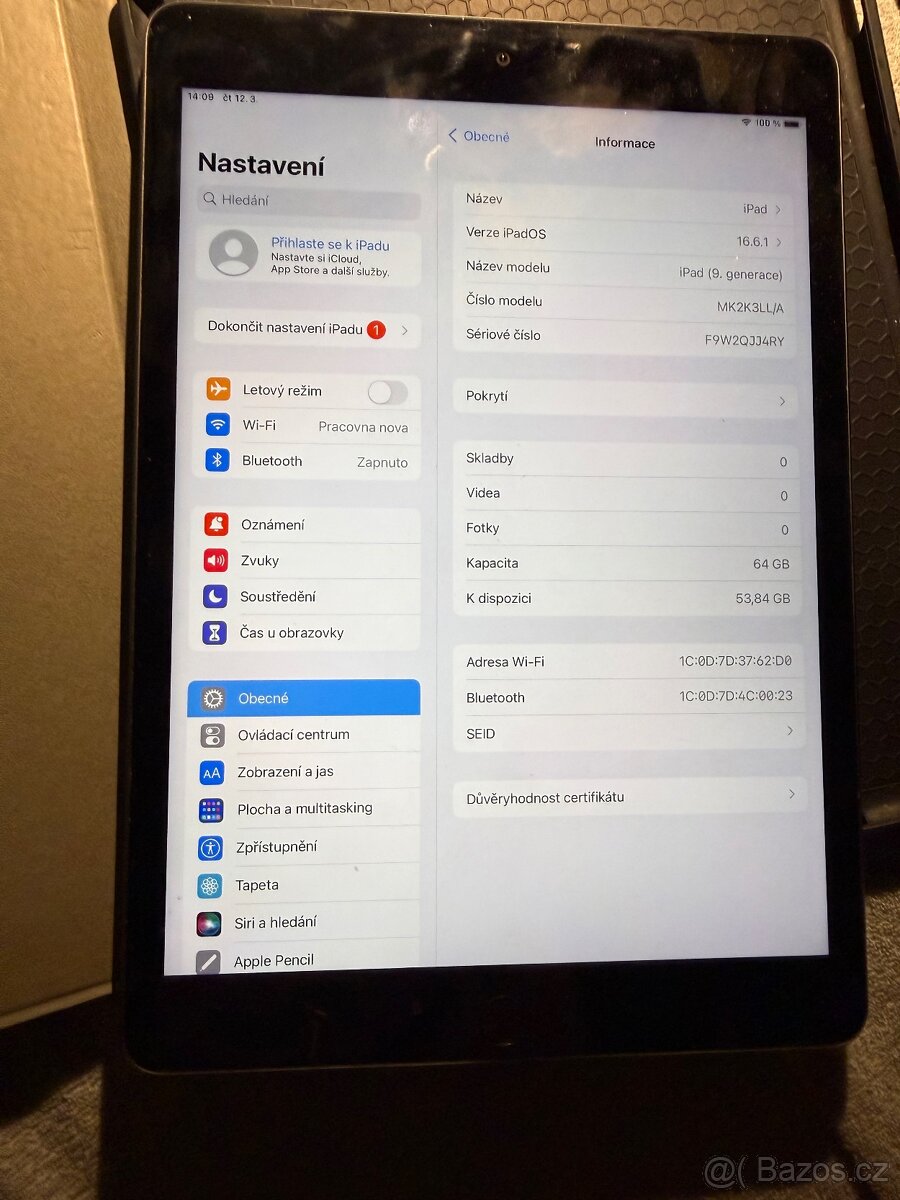 iPad (9th Generation) Wi-Fi + Cellular - [6.3. 2026]Prodám iPad (9th Generation) Wi-Fi + Cellular ve velmi dobrém stavu (téměř nepoužíváno) v originálním balení. Vše je plně funkční, tablet není poškrábán, displej není prasknutý a baterie je díky malému cyklu nabití ve velmi dobrém stavu.