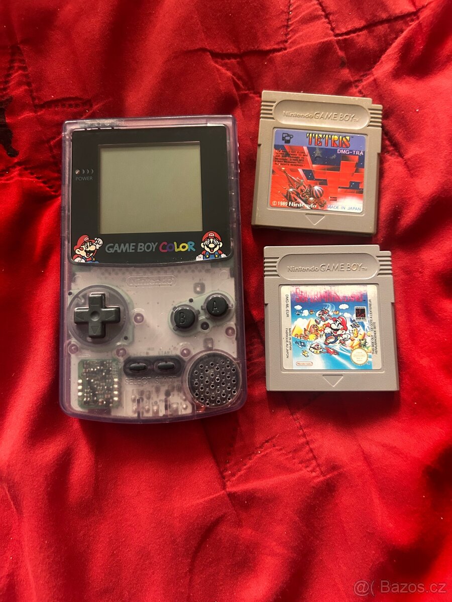 Prodám plně funkční retro herní konzoli Nintendo Game Boy Color v oblíbené průhledné fialové barvě (Atomic Purple). Konzole je ve velmi zachovalém stavu, málo hraná a pečlivě udržovaná. Na displeji je instalováno ochranné sklíčko s motivem Maria.