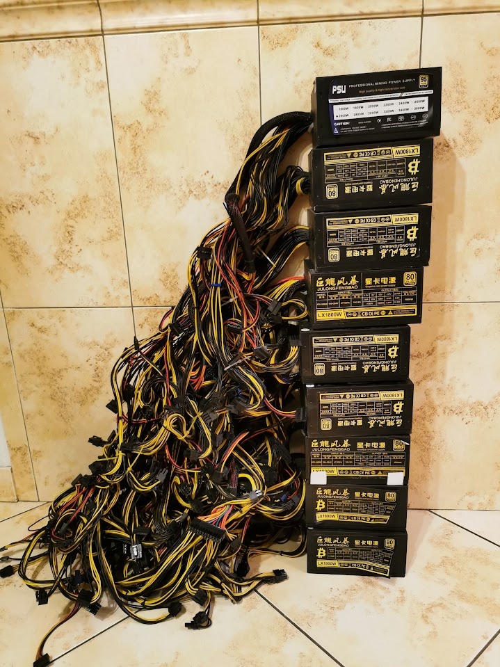 8x PSU počítačové zdroje používané na Mining. Bezproblémové zdroje s vysokým výkonem. Všechny základní kabely integrované.