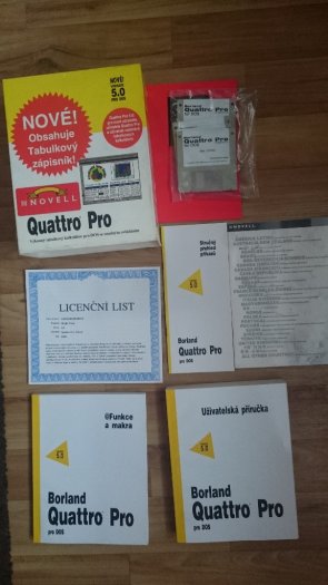 Prodám retro software Quattro Pro, verze 5.0 obsahuje: instalační diskety, licenční list, podrobné uživatelské příručky v češtině, příručky Funkce a makra a stručného přehledu příkazů. Z roku 1995, cena 390,- Kč plus poštovné 80,- Kč