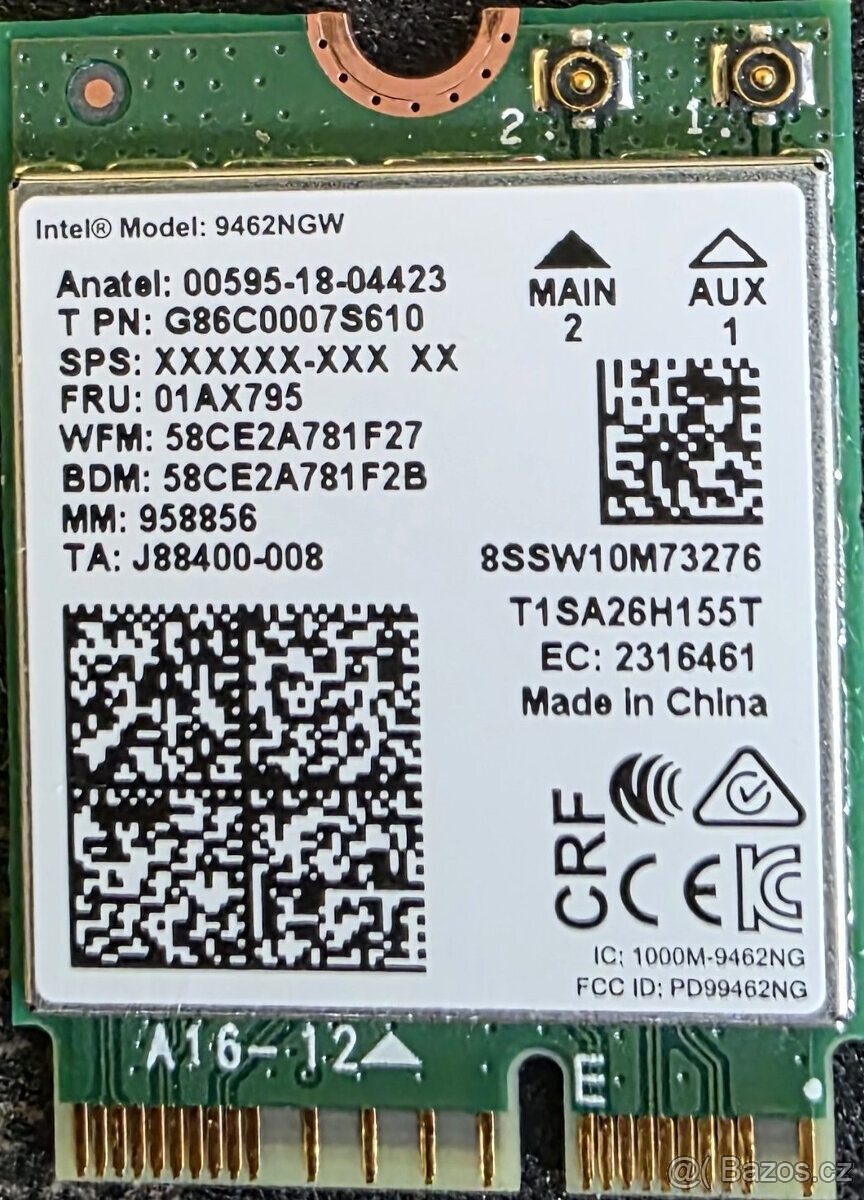Prodám wifi síťovou kartu Intel® Wireless-AC 9462 (model 9462NGW) do notebooku nebo mini PC.Podporuje standard 802.11ac (Wi-Fi 5), dokáže pracovat v pásmech 2,4 GHz i 5 GHz. Obsahuje v sobě také Bluetooth modul (verze 5.1), takže umožňuje připojení bezdrátových sluchátek, myší nebo klávesnic. Maximální teoretická rychlost přenosu dat je 433 Mbps.Jedná se o slot typu M.2 2230 s klíčem „E“ s konektory IPEX MHF4 pro připojení antén. Zašlu na dobírku Zásilkovnou na vámi určené místo, poštovné v ceně.