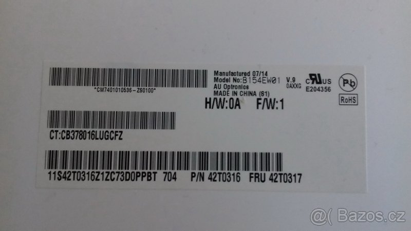 Nabízím nepoškozený funkční displej 15" B154EW01 P/N: 42T0316 z notebooku Lenovo.