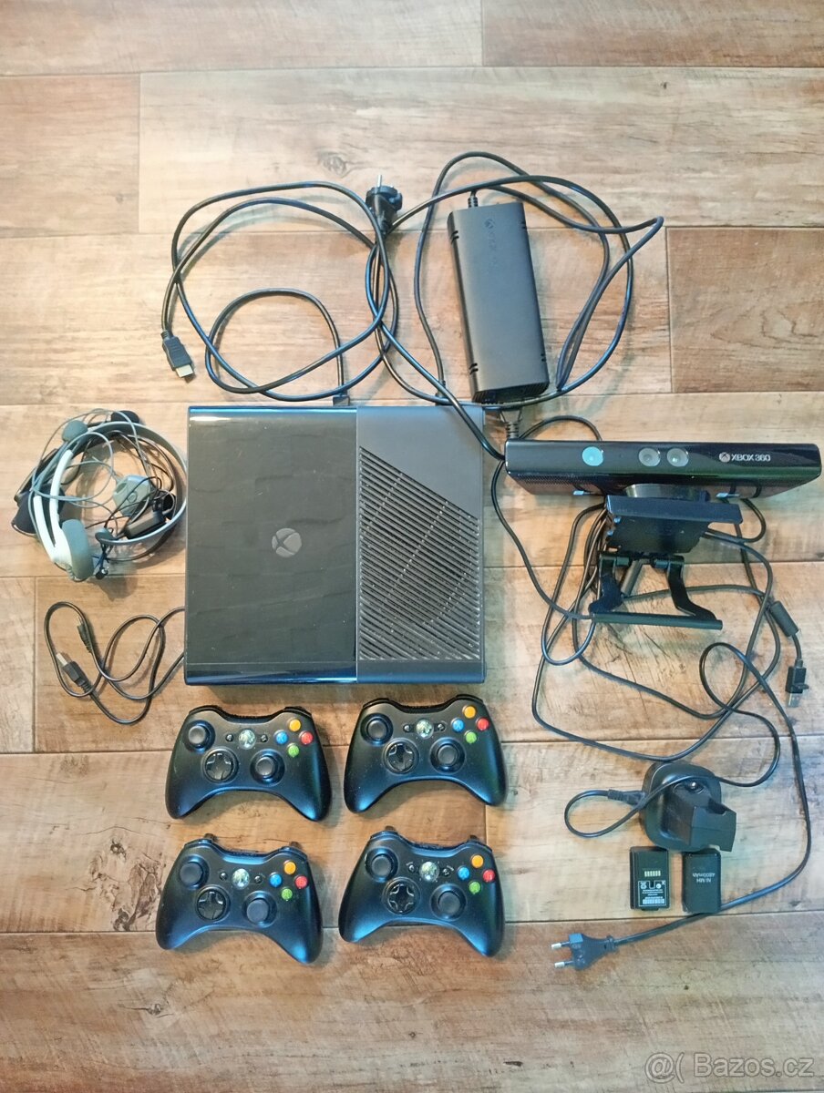 Xbox 360, paměťová karta 250GB (uložená spousta demo her), 4x ovladač, kinect, nabíjecí stanice.