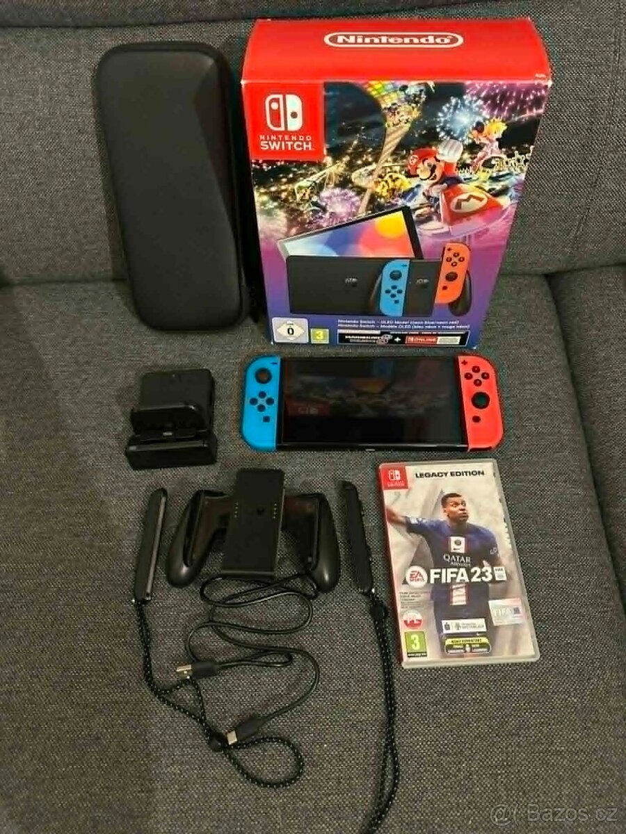 Prodám nintendo switch OLED v krásném stavu (nepoškrábané, displej netknutý), plně funkční. Součástí je vše co vidíte na foto, tedy:
